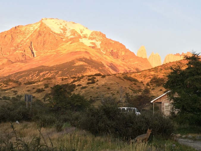 I decided not to answer them till after breakfast. The breakfast room at Refugio Central provides a clear view of the top of the towers. As dawn broke over the towers, I went out and stood in the cold with my camera. It was the perfect sunrise – this was the morning to be at the base of the towers. Then a fox appeared, with its bushy tail set against the backdrop of the glowing towers.